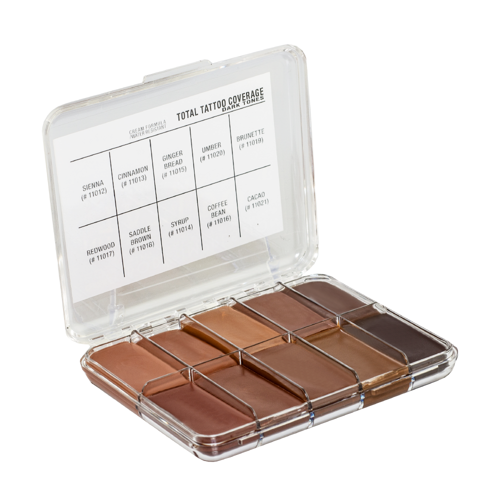 Total Tattoo Coverage is highly desired product used intensely in the Films and Television. Total Tattoo Coverage is available in 3 different palettes Original, Dark and Primary Colors which can be used as a base color on skin or as a clown colors.