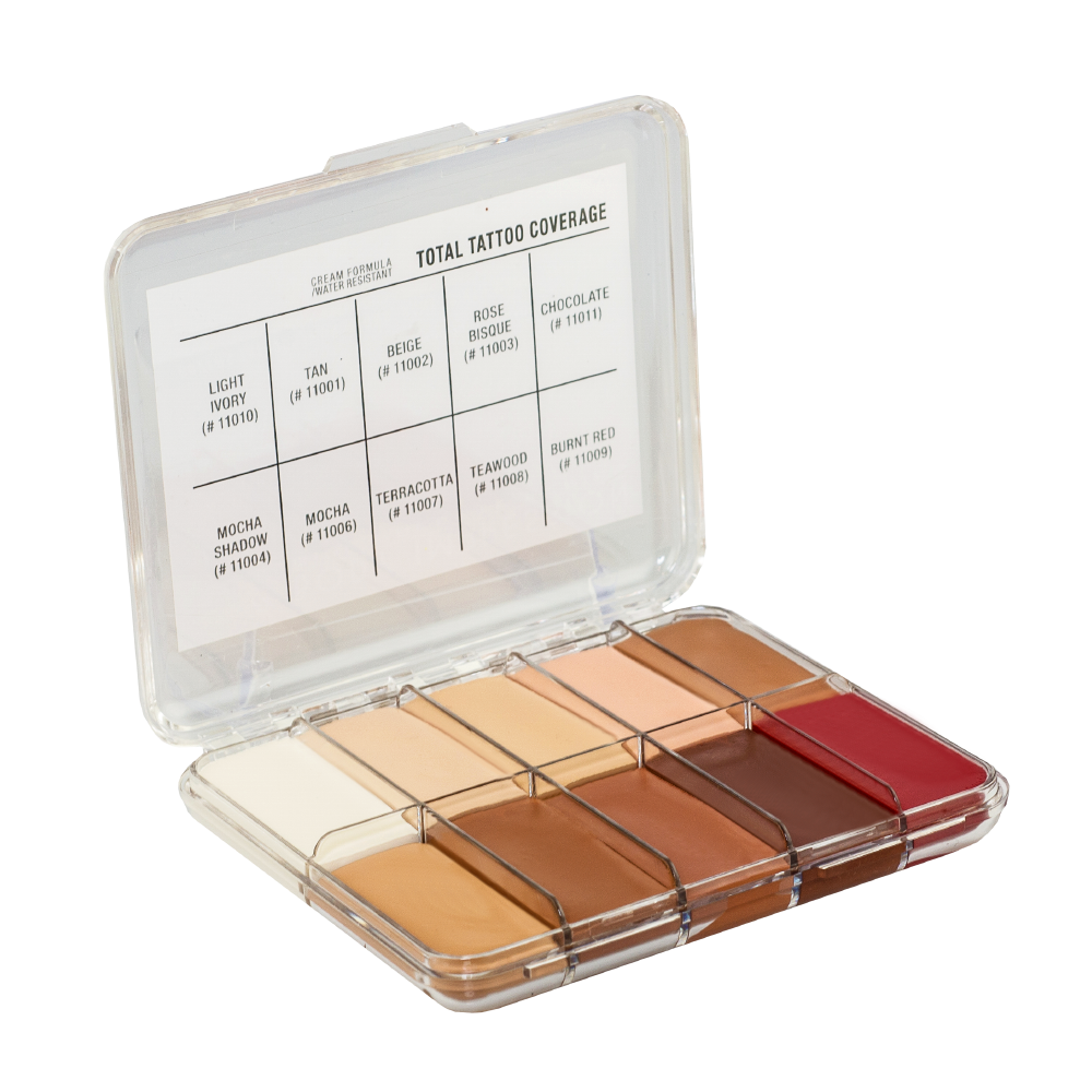 Total Tattoo Coverage is highly desired product used intensely in the Films and Television. Total Tattoo Coverage is available in 3 different palettes Original, Dark and Primary Colors which can be used as a base color on skin or as a clown colors.