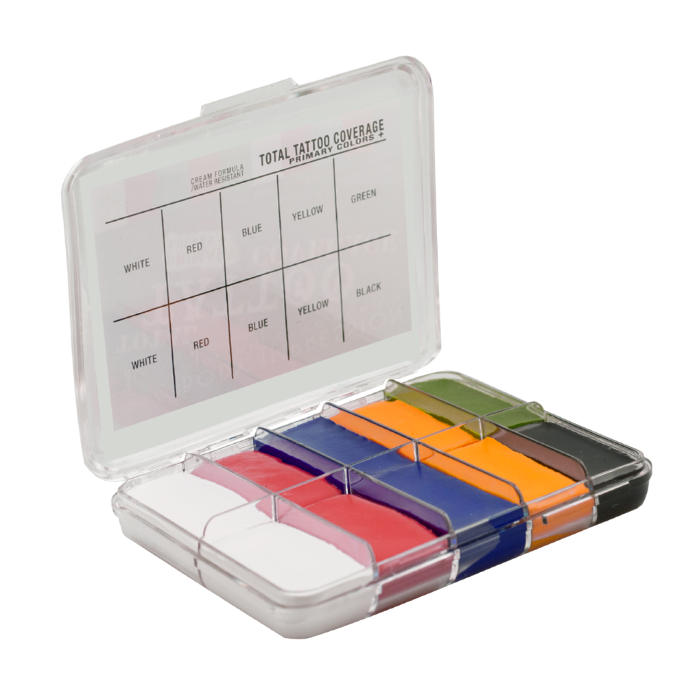 Total Tattoo Coverage is highly desired product used intensely in the Films and Television. Total Tattoo Coverage is available in 3 different palettes Original, Dark and Primary Colors which can be used as a base color on skin or as a clown colors.